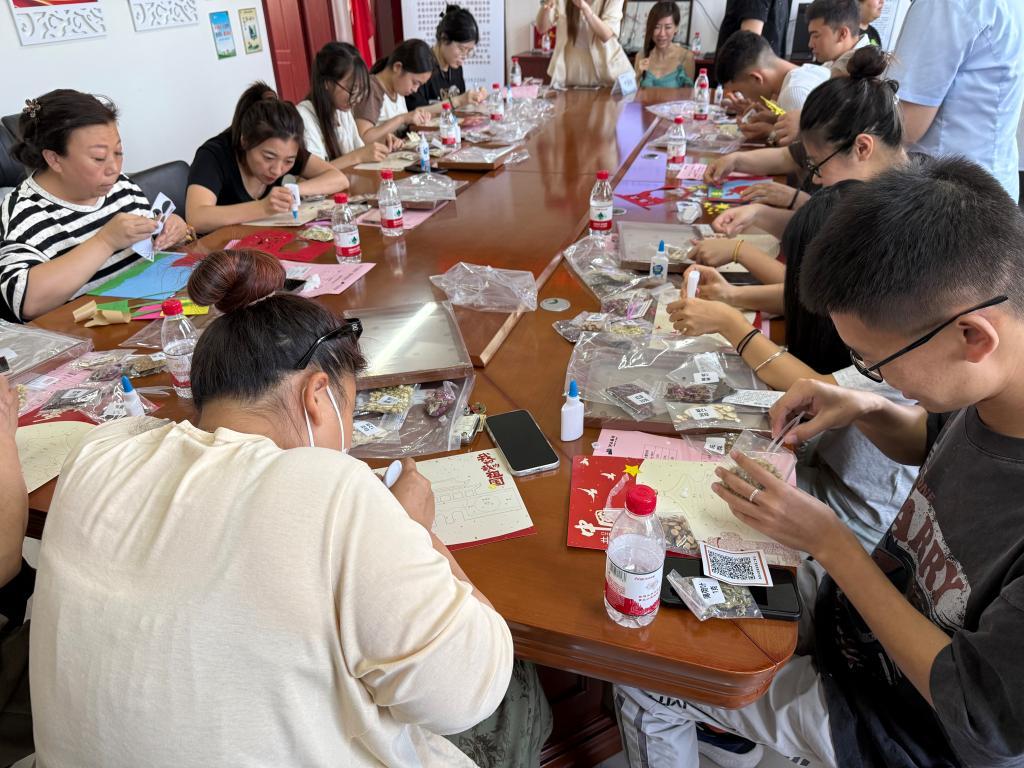 在随后开展的“草药氛围画制作”环节,支部成员提前筛选花草、分类中药切片,对动手较慢的老人一对一提供帮扶。同时,成员们还穿插讲解草药知识,让居民在拼贴时既能感受手工乐趣,又能了解中医文化。在大家的共同努力下,20余幅色彩鲜活、饱含心意的草药画顺利完成,现场氛围热烈温馨。
